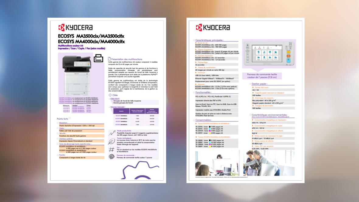 Le Duplex est une fiche PDF téléchargeable qui regroupe, en un document recto-verso, les informations clés sur une gamme de produits ou un logiciel Kyocera. Il est disponible directement sur les pages produits depuis votre espace partenaires sur le portail MyKyocera, dans la section documentation.
