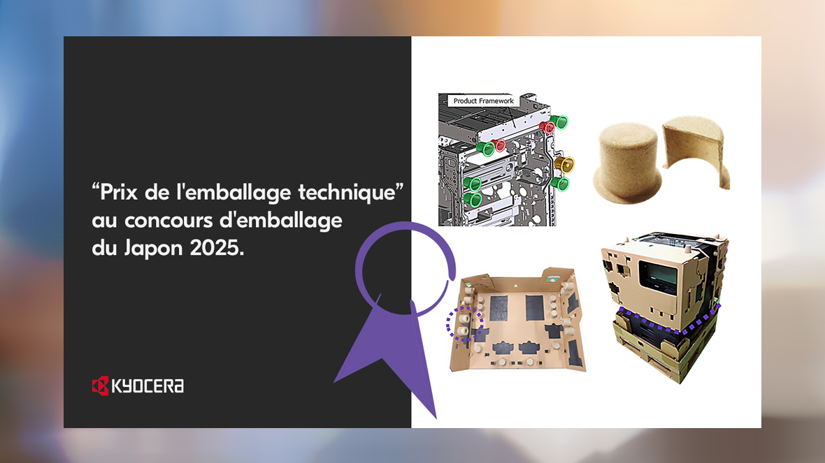 Kyocera Document Solutions a obtenu le prix de l’emballage technique lors du concours japonais de l'emballage 2025 ! Grâce à une refonte complète de nos matériaux de rembourrage, nous avons réduit de 72 % la quantité d’emballage utilisée par appareil, amélioré l’absorption des chocs grâce à une conception en forme de coupelle et diminué notre empreinte écologique avec des matériaux en pâte à papier hautement biodégradables.