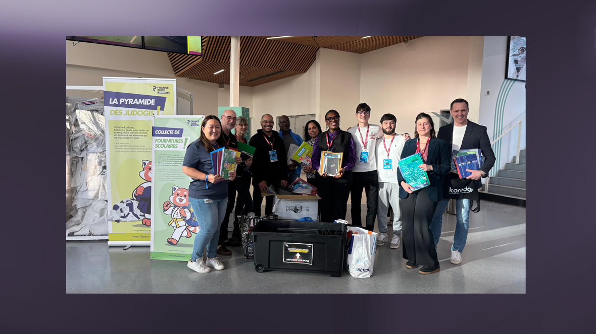La collecte de fournitures a été donnée le dimanche 8 février lors de la 2ème journée du Grand Slam de Paris en compagnie de Emilie ANDEOL, vice-présidente de France Judo en charge du Judo-Santé et de la RSE et Frédéric GEVREY, directeur général de Koredge.