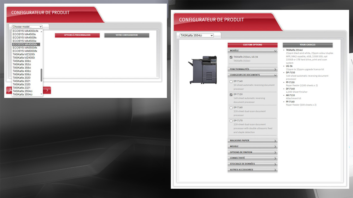 Une fois sur le configurateur vous pouvez désormais choisir le modèle qui vous intéresse grâce au menu déroulant en haut à gauche et configurer votre produit :
