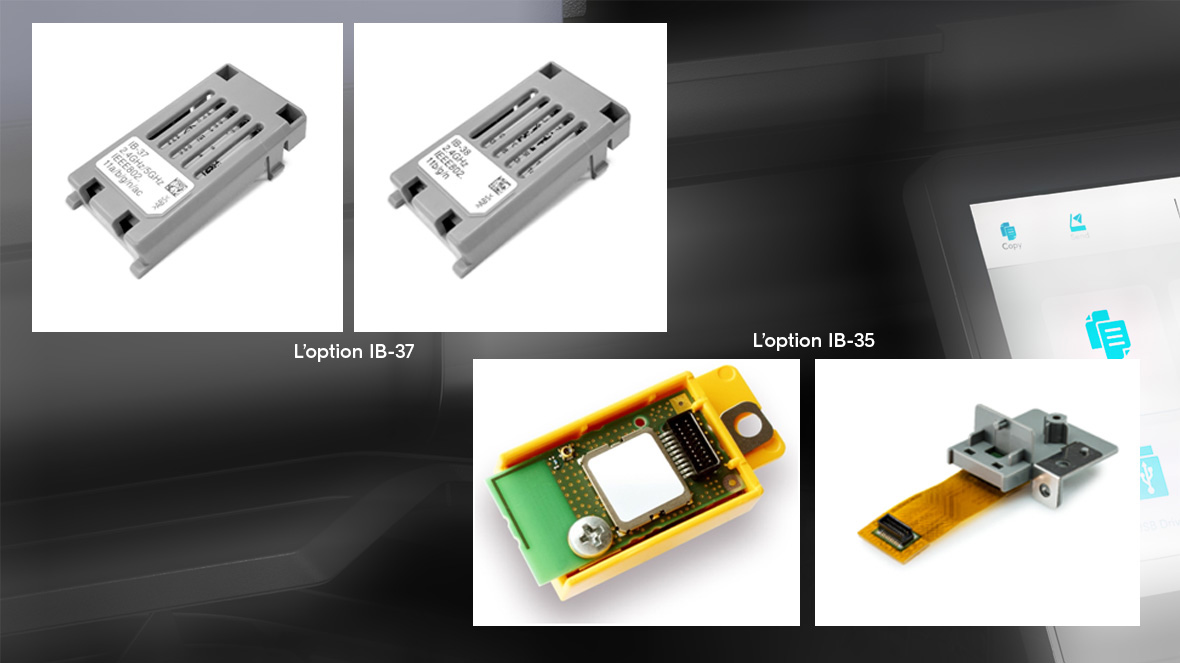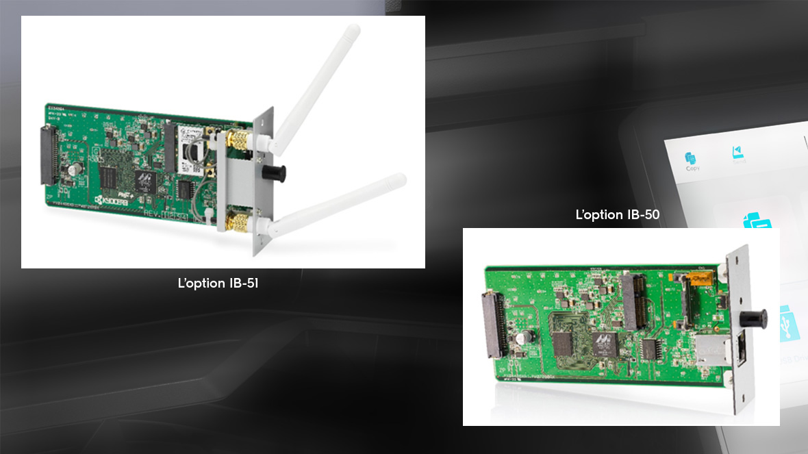 valable sur la gamme A3 et l’option IB-36 valable sur la gamme A4 sont des cartes optionnelles wifi 802.11b/g/n avec une portée de 30m. Cette carte permet de connecter le copieur à l’infrastructure Wifi du client, ainsi que la possibilité de connecter un seul appareil à la fois en mode wifi direct. Ces cartes sont entièrement compatibles avec Kyocera Fleet Services.