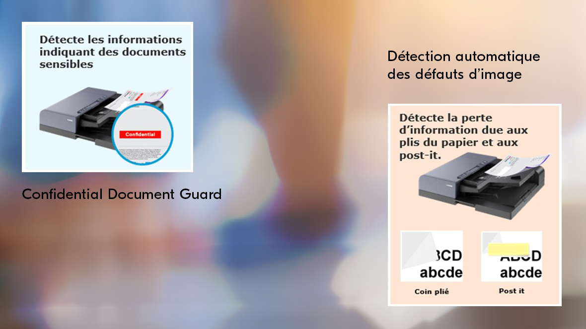 Grâce à l’IA embarquée, le multifonction détecte les anomalies lors de la numérisation (coin plié, post-it) et alerte ou bloque l’impression et/ou la numérisation. Cela peut être reconnu immédiatement, réduisant ainsi la charge de travail liée à la vérification et à la nouvelle numérisation des données.