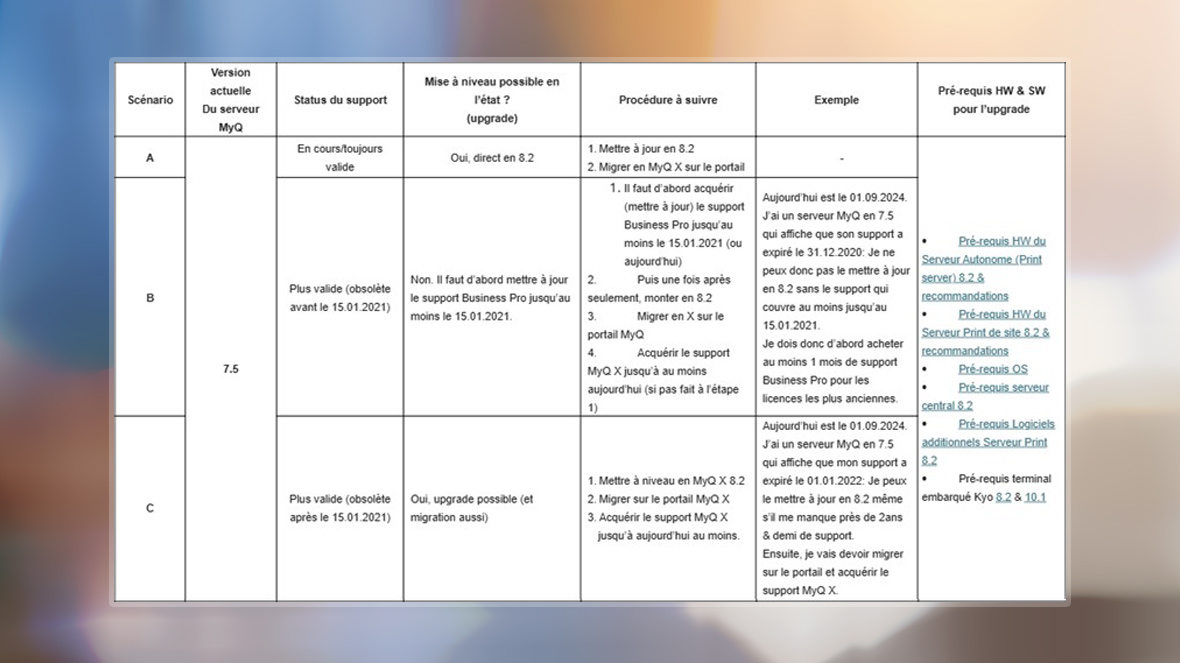 dans les installations précédentes en « Business Pro », la fin générale du support mentionnée était celle de la date de support de la plus ancienne des licences. Par exemple pour une date de support générale obsolète au 08.12.2020, cela veut dire qu'il y avait peut-être d'autres licences de support qui avaient expiré plus tôt en 2019 ou plus tard en 2021, etc... Le serveurs Print & Central MyQ X 10.0 sont obsolètes depuis le 02.03.2023. Le serveur Print & Central MyQ X 10.1 sont obsolète depuis le 17.06.2024. Le terminal Kyocera 8.1 est obsolète depuis le 12.09.2022. Le terminal Kyocera 7.5 est obsolète depuis le 18.02.2022. Lors de la migration en X, si le support est toujours valide, il est conservé et est aligné pour avoir une date unique. Pour toutes les versions < 7.5, passez d’abord en 7.5 (puis en 8.2). On ne peut mettre à jour vers la version 10.2 que depuis une version 8.2+ Il est nécessaire que la maintenance d’un serveur soit constamment à jour.