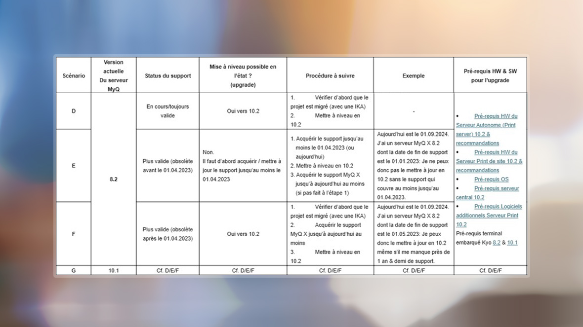 En effet, les versions Kyocera Net Manager et MyQ X v.8.2 sont désormais en fin de vie. C’est pourquoi nous encourageons fortement à migrer tous vos clients dès maintenant vers la version 10.2 de Kyocera Net Manager (KNM) et MyQ afin d’avoir tout le support et paramétrage nécessaire à la bonne utilisation de ces logiciels.