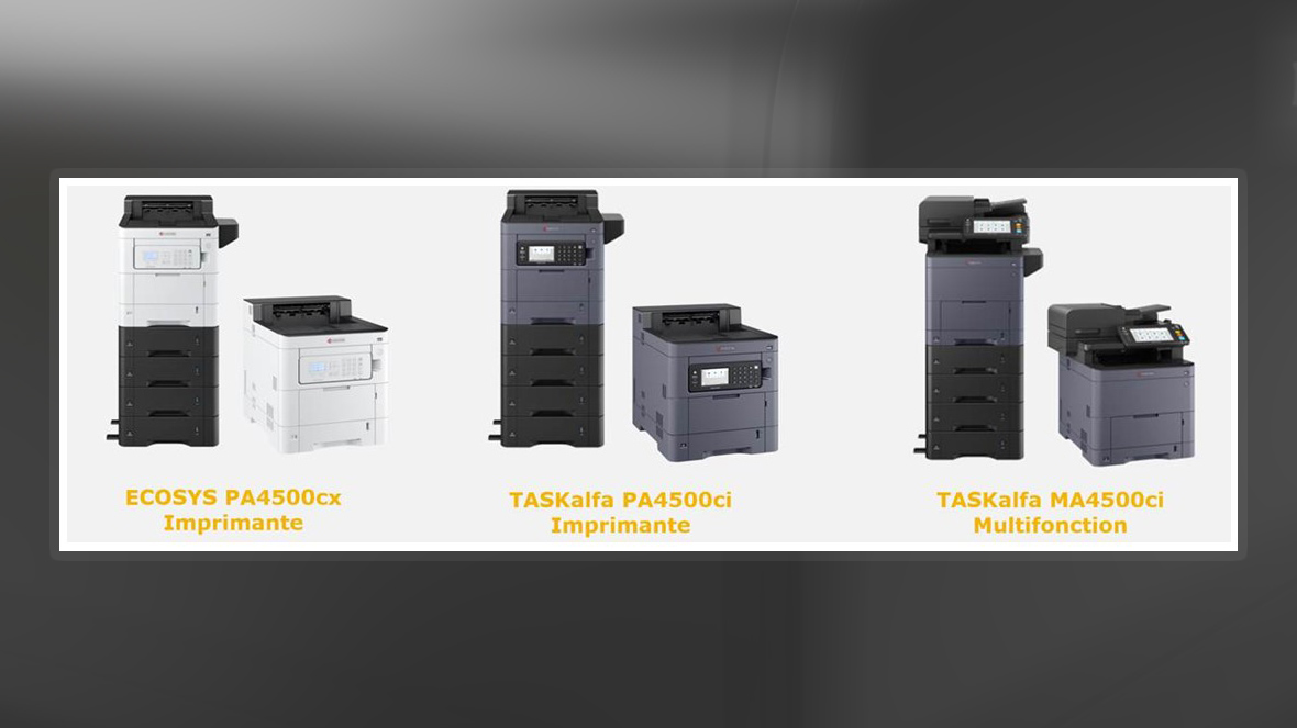 L’imprimante ECOSYS PA4500cx vient compléter la gamme A4 couleur sortie en septembre dernier et la TASKalfa MA4500ci vient compléter la MA3500ci.