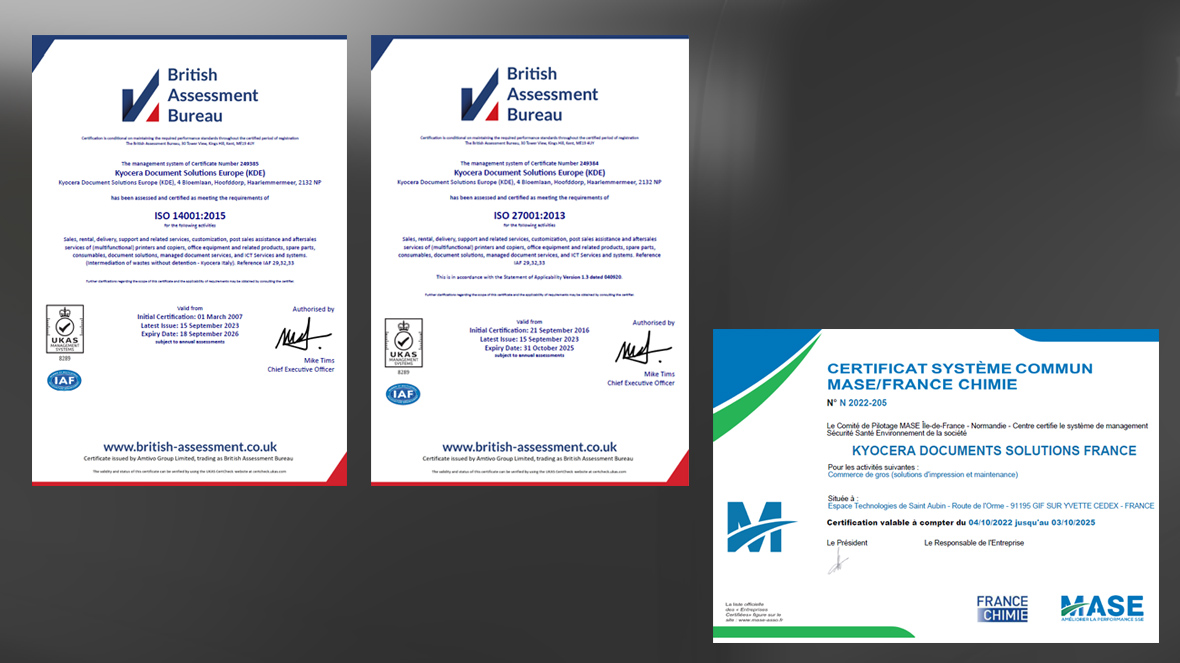 Comme vous le savez, KYOCERA Document Solutions France est certifié depuis plusieurs années pour des systèmes Qualité Santé Sécurité Environnement (QSSE).