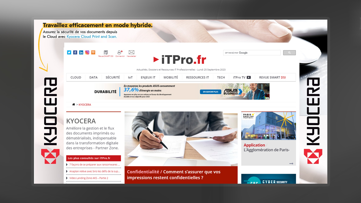 Kyocera bénéficie d’une zone dédiée sur le site d’IT Pro avec une belle visibilité autour de nos solutions logicielles Cloud. Cette zone sera alimentée jusqu'à la fin de l’année avec des dossiers thématiques et rubriques contenant des articles, des actualités, des études de cas et des vidéos explicatives.