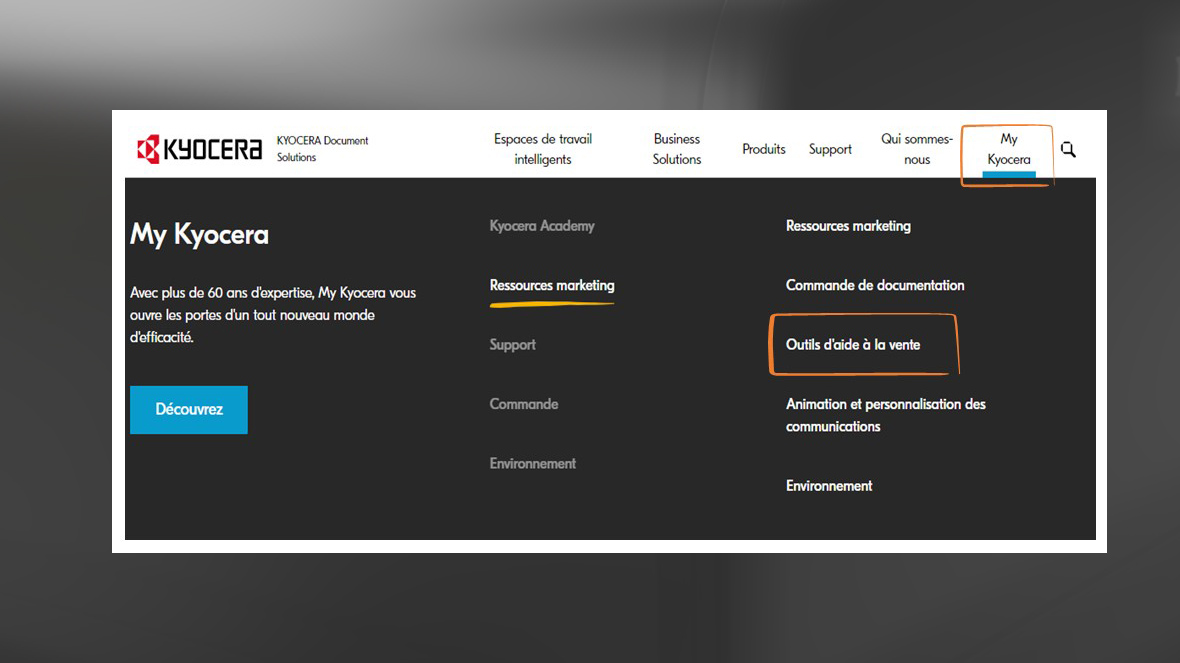 Une fois connecté, rendez-vous dans la rubrique MyKyocera > Ressources marketing > Outils d’aide à la vente.