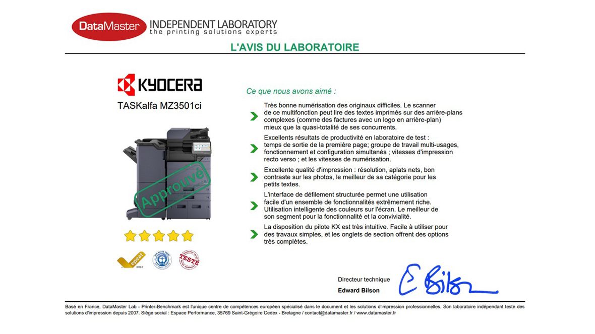 Les derniers TASKalfa MZ2501ci et MZ3501ci obtiennent cinq étoiles du laboratoire DataMaster !